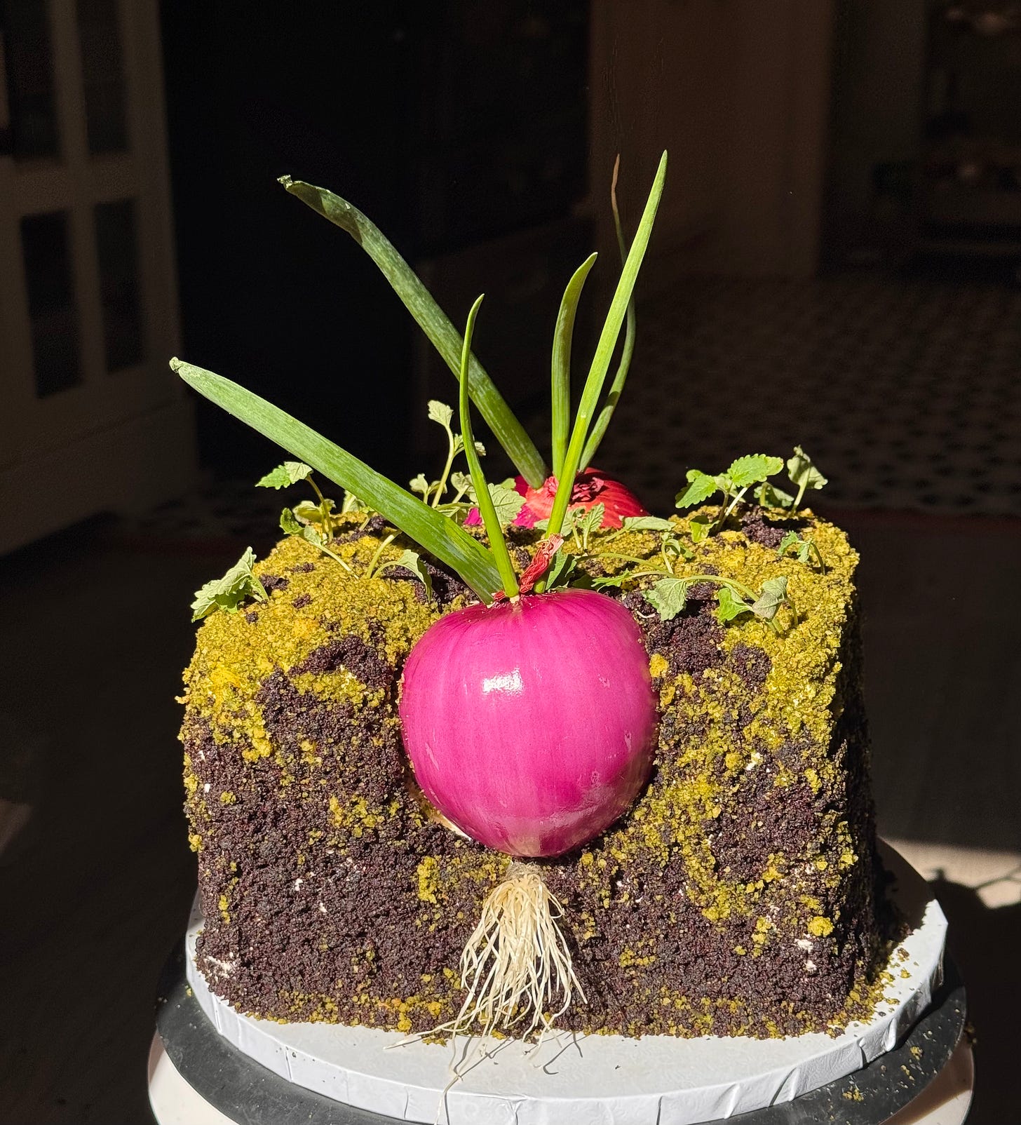 If you really want to go the full, oniony distance and model this around a patch of dirt, I recommend baking off an extra layer of chocolate cake and crumbling it up for “dirt”, which you can adhere to the exterior of the cake. If you want the mossy look as well, crumble up any white/yellow cake and mix in matcha and a touch of cocoa powder until you reach your desired mossy green. Use sparingly, as this flavor won’t meld as well.